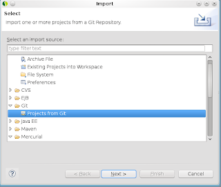 Non resta quindi che importare il tutto in Eclipse: avviate la procedura di import di un nuovo progetto, scegliete Git come tipo di progetto e specificate la directory appena popolata. Ovviamente non dovete creare un progetto nuovo, ma un progetto esistente a partire dall'albero dei sorgenti.
