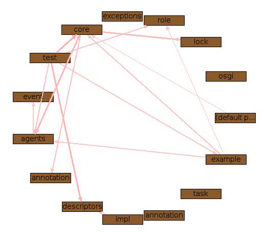 This does not automatically imply a bad OOP design, because the RoleBooster is the central "actor" that must make all the other small classes and objects cooperating together. So, while the RoleBooster itself allows a plug-in architecture, it must use such plugins, resulting in a big chunk of code, even if highly customizable. This situation becomes even clearer looking at the class dependency graph, that shows how the RoleBooster is tied to a lot of other interfaces without having though strong connections.